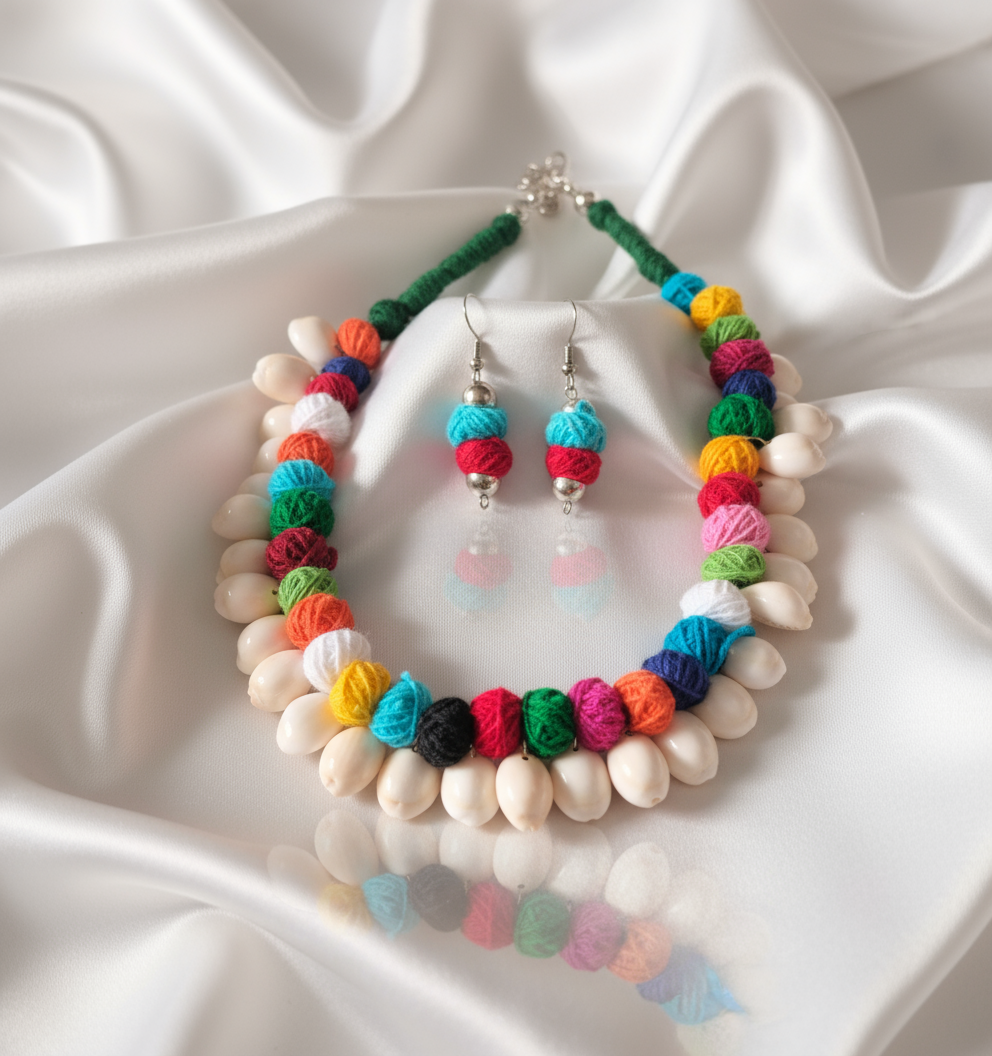 The Carnival Dreams Necklace Set brings color, happiness, and craft together. It shows how simple materials can make something full of life. Here, bright thread-wrapped beads mix with smooth wooden ones to create a lively, handmade look. Each piece feels cheerful and warm because it carries the touch of the artist’s hands. So, it feels like wearing a little piece of sunshine every day.