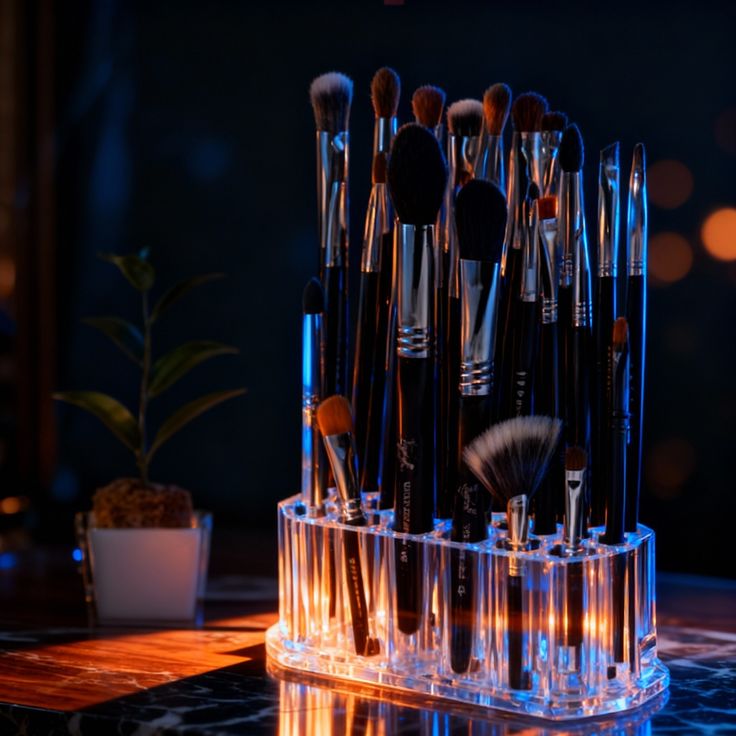 Next, this brush stand is made with clear crystal acrylic that feels light and smooth. Also, it’s very simple to clean just wipe with a soft cloth. The steady base keeps it firm, even when it’s full. Therefore, your brushes always stay in place. Moreover, the clear body helps you see every brush quickly, making your routine easier and faster.