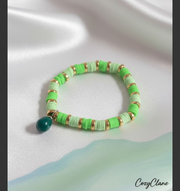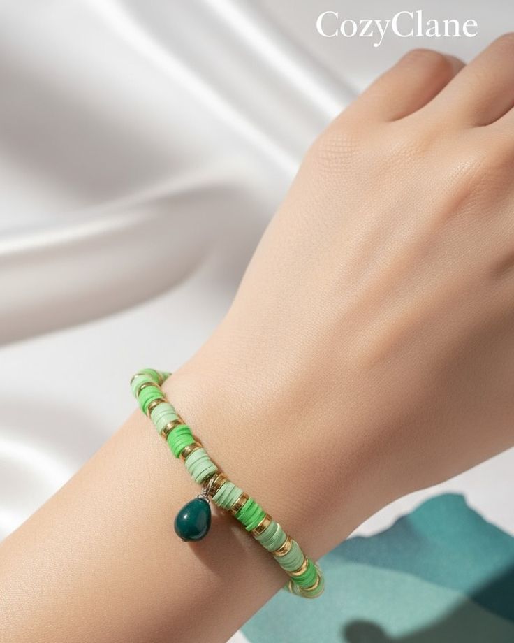 The shades of green in this bracelet reflect nature’s peace. The deeper green stands for strength, while the lighter tones show freshness and renewal. Together, they bring a feeling of calm energy. Moreover, the small green charm adds a touch of natural grace, just like a dewdrop resting on a leaf.