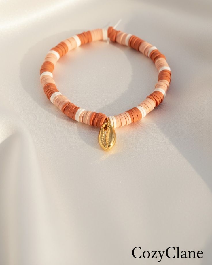 This bracelet blends creamy beige and roasted brown tones beautifully. Together, they create a cozy mix that feels both earthy and stylish. Additionally, the golden shell charm adds a soft glow, making every piece look graceful and unique. Because of its neutral shades, it matches easily with most outfits — from your casual looks to soft evening wear.